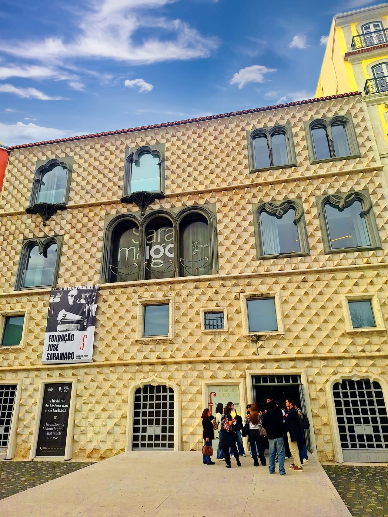 El tour continúa en la Casa dos Bicos, símbolo arquitectónico que integra restos de murallas romanas, islámicas y medievales, además de albergar la fundación de José Saramago.